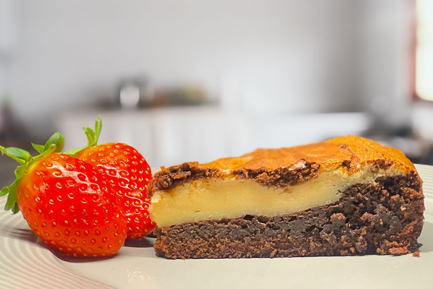 Einki er sum ein góð ostakaka. Enn betur verður hon við einum lekkrum heimagjørdum botni. Her baka vit lekkru sjokulátakakuna fudgebrownie og brúka hana sum botn í ostakakuni.